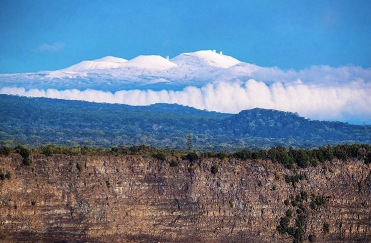 The beauty of the snowy mountain tops of Mauna Kea yesterday morning. With the forested slopes of Mauna Loa & the caldera walls of Kīlauea in the front. The beauty of our ‘āina, the very place we strive to protect💚